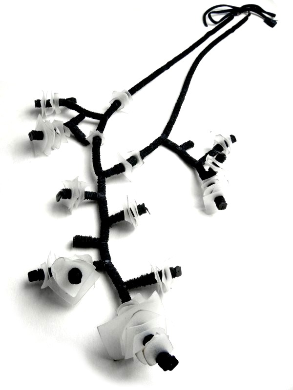 Geometric and organic necklaces and earrings are inspired by consumed